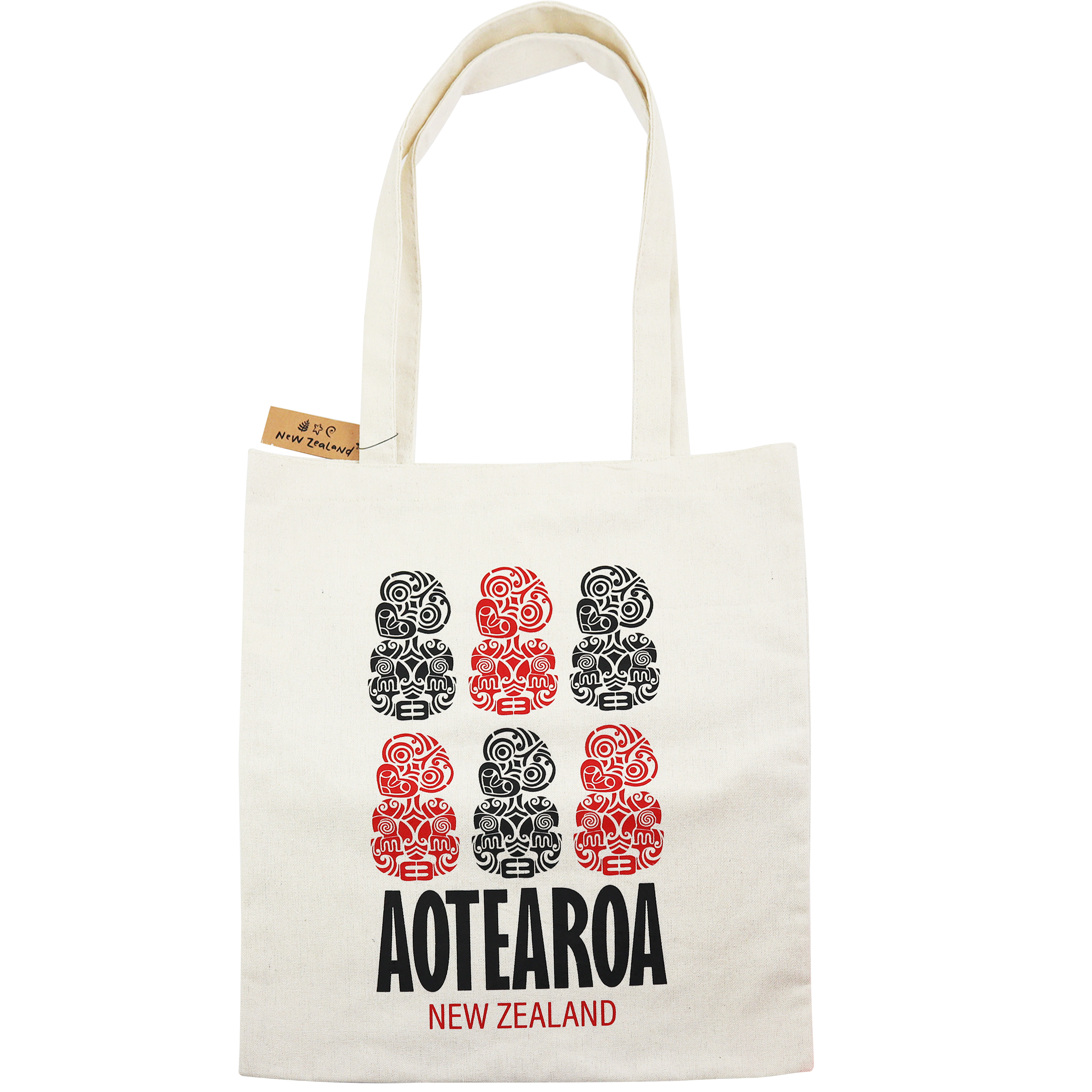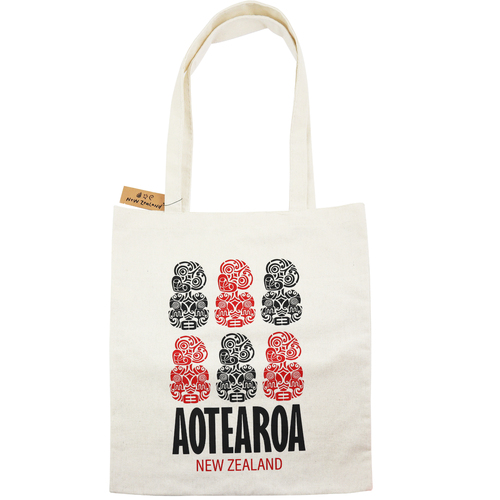 A cotton tote bag with a black and red tiki design. Add a touch of New Zealand culture to your everyday with this handy tote bag, perfect for shopping.