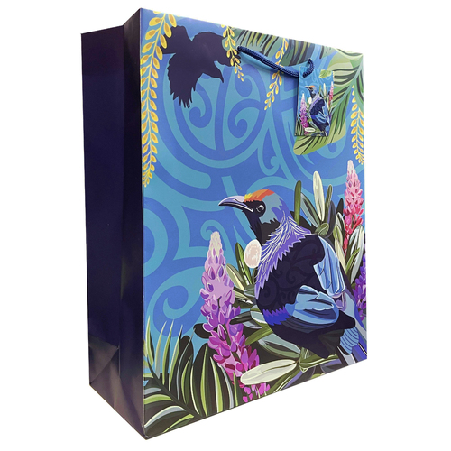 This vibrant navy blue gift bag is patterned with koru patterns in the background, a tūī bird and native plants of New Zealand! The handles come with a mini gift card attached to write 'to', 'from' and other messages for the gift recipient.