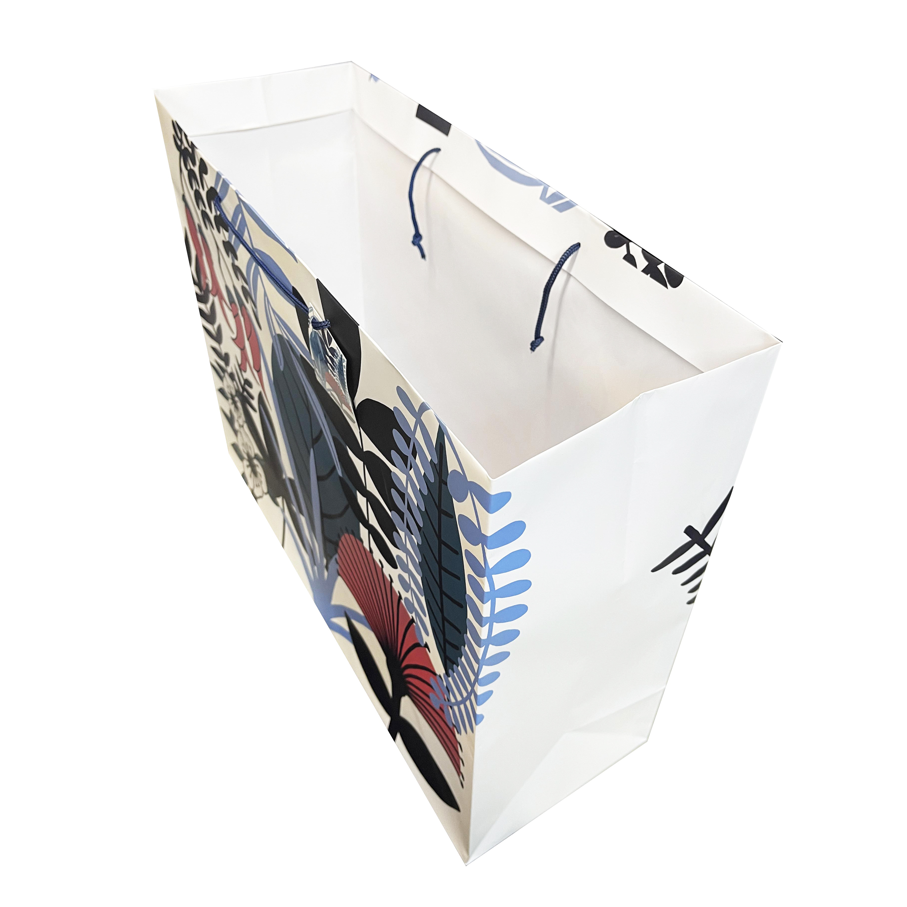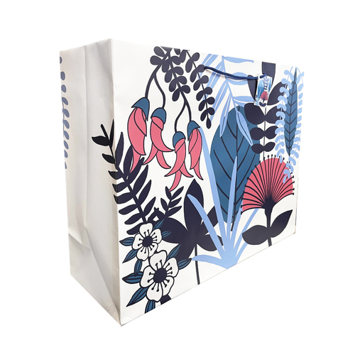A xtra-large landscape gift bag of New Zealand native plants with navy blue, dark pink-red coloured floral and leafy patterns. he handles come with a mini gift card attached to write 'to', 'from' and other messages for the gift recipient.