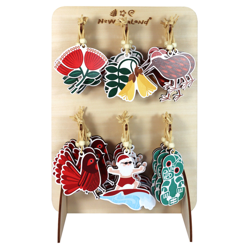 Bring the magic of a Kiwi Christmas to your tree with our iconic wooden ornaments! Each vibrant piece features beloved New Zealand symbols like a Surfing Santa, playful Fantail, native Kiwi, and the beautiful Kōwhai, Pōhutukawa, and Tiki. Displayed on a natural wooden stand, these unique decorations are a festive celebration of New Zealand culture.