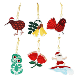 - 6 Assorted: Surfing Santa, Pōhutukawa, Kōwhai, Kiwi bird, Tiki, Fantail.