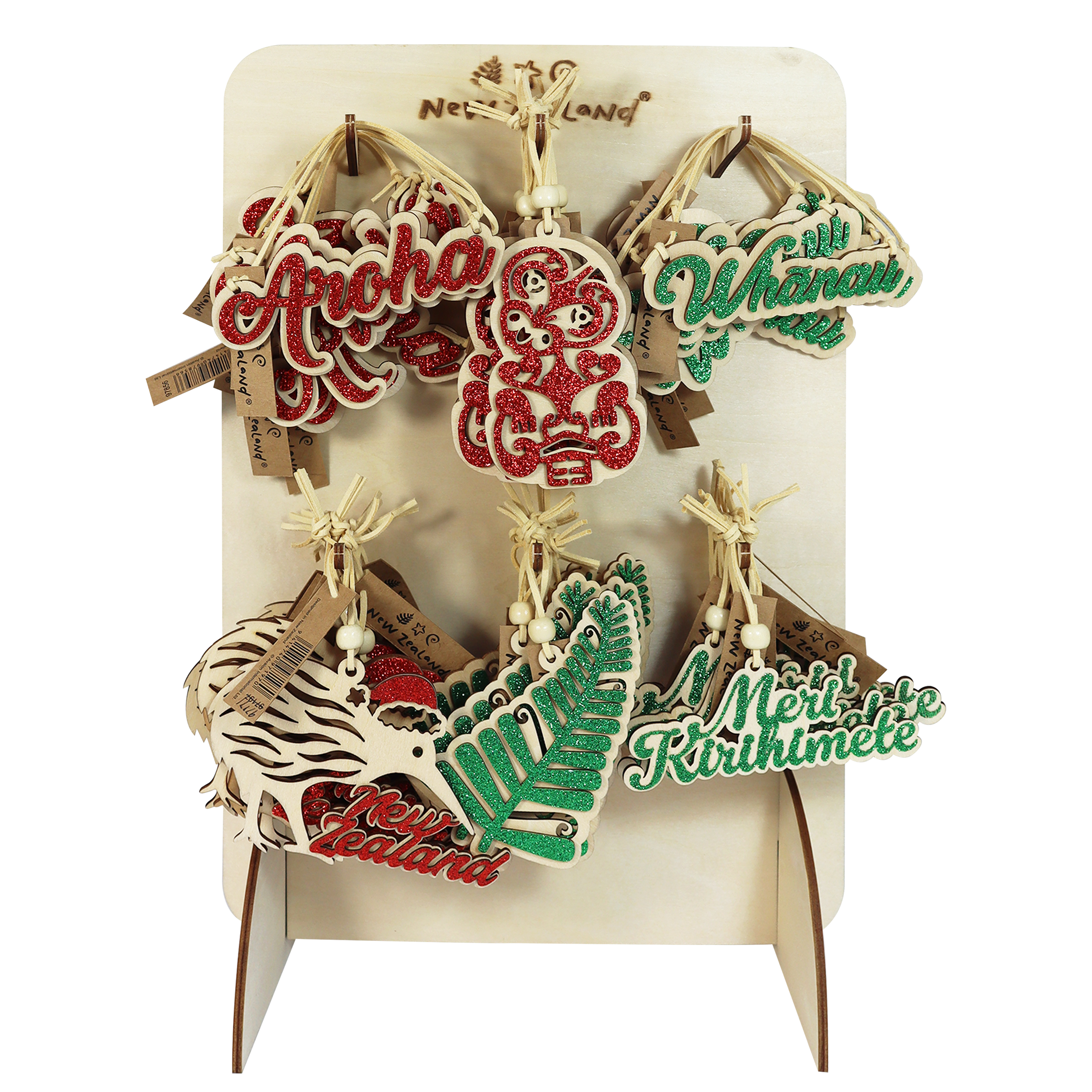 Deck out your tree with a touch of Kiwi magic this Christmas! Our iconic wooden glitter ornaments feature 6 beloved Kiwiana designs: Aroha, Tiki, Whānau, Kiwi, Fern, Meri Kirihimete. Presented on a natural wooden stand, these vibrant, unique decorations are a beautiful celebration of New Zealand culture.