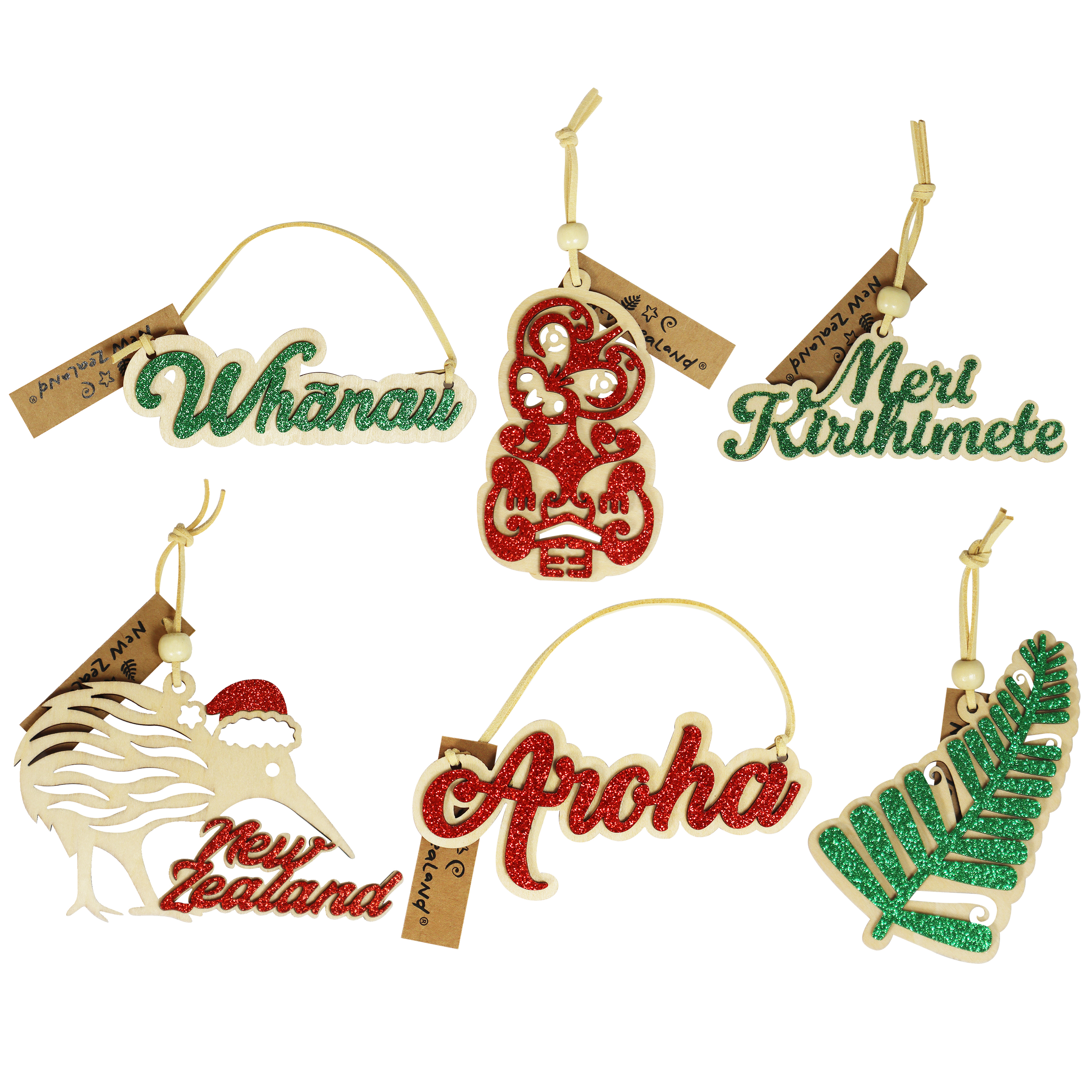 - 6 Assorted: Aroha, Tiki, Whānau, Kiwi, Fern, Meri Kirihimete.