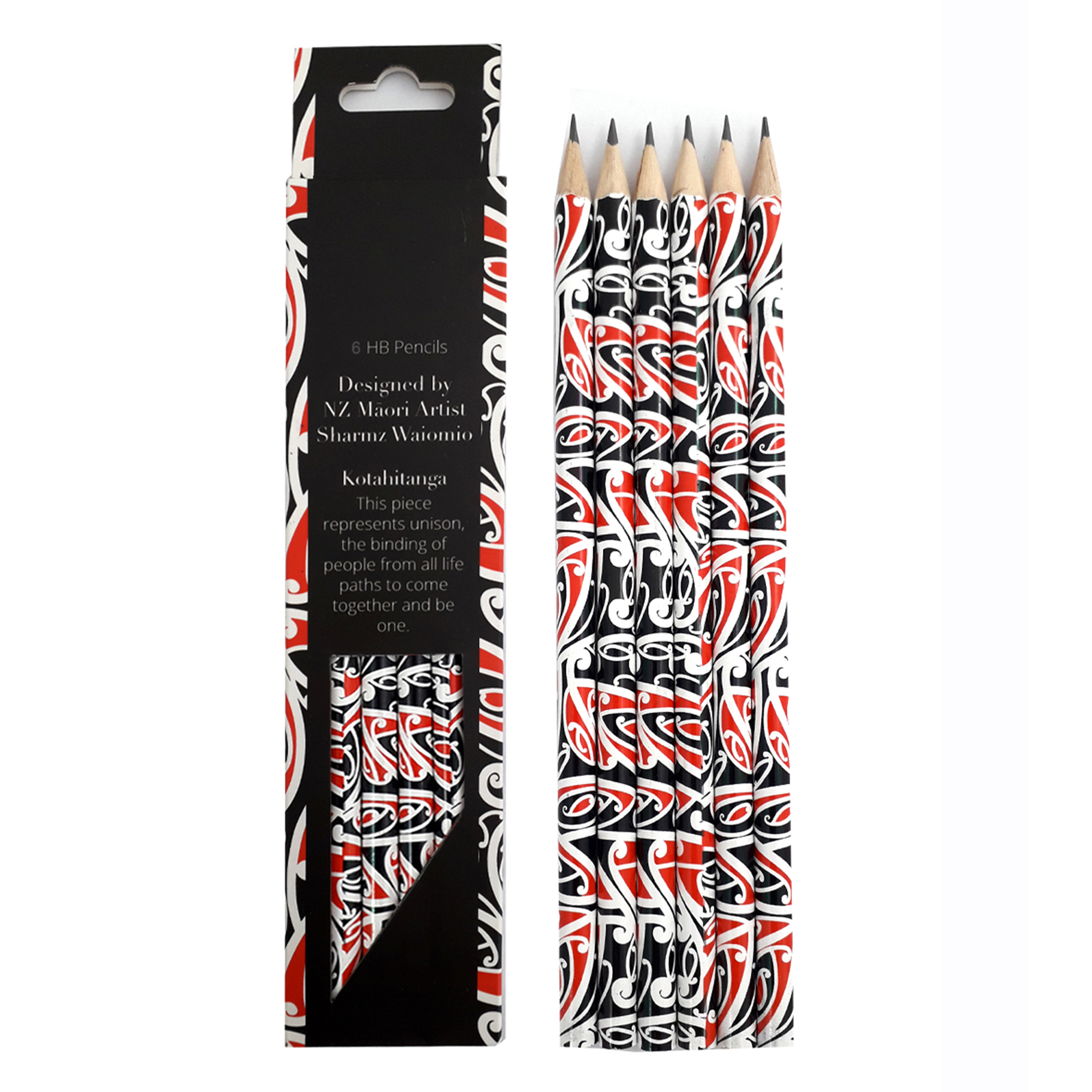 A box of round HB pencils with specially design Māori artwork. No eraser at end.